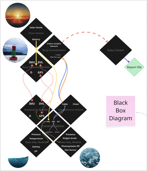 From the structure to the buoy, there will be a chain and a cable, for both structural support and data and power connection between the 2 elements. Finally, all the data collected will be sent to a data center, this will be done via the standard Iridium Satellite Network.
